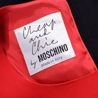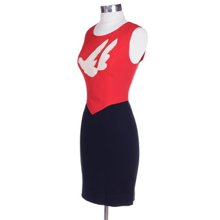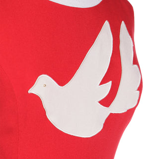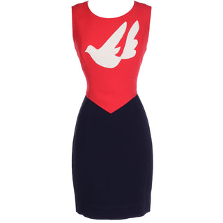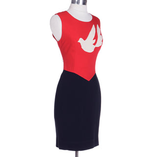 This vintage 1990's Franco Moschino red and black sleeveless dress features a beautiful cream dove applique at the center front of the bodice. This dress was designed by Franco Moschino and it is in the familiar red and black that he often used to reference Olive Oyl. This dress is most likely a nod to a desire for peace.
