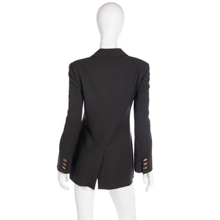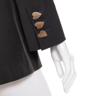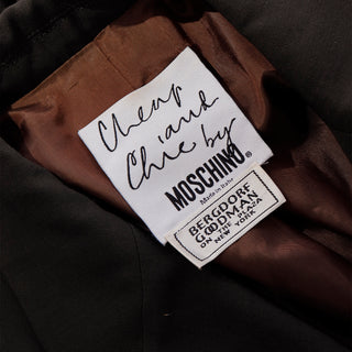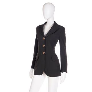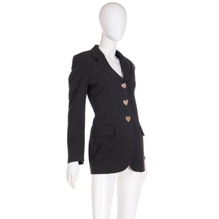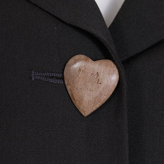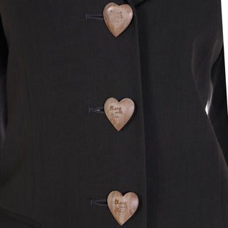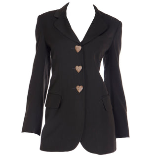 This Cheap and Chic by Moschino vintage classic longline blazer style jacket would be a great addition to any wardrobe! This Moschino jacket has fabulous branded Cheap and Chic wood heart buttons down the front and unbranded heart buttons on the cuffs. The buttons make this an unmistakable Moschino piece! This jacket was purchased at Bergdorf Goodman in the early 1990's and it is fully lined.