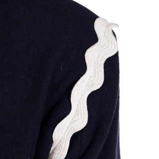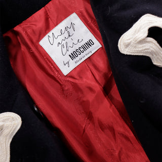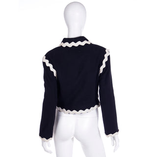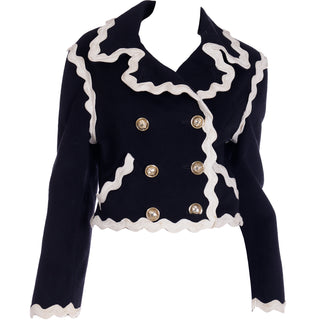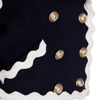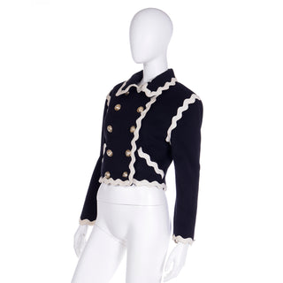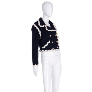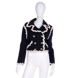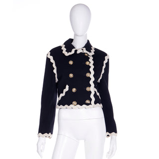 This fabulous F/W 1991 Franco Moschino vintage black wool cropped jacket features cream ric rac trim and gold C C (Cheap and Chic) buttons with a cross in the center. The double breasted jacket is lined in a beautiful red logo lining and of course, it is beautifully made! We are showing an image of it from the F/W 1991 Moschino release in a longer version.