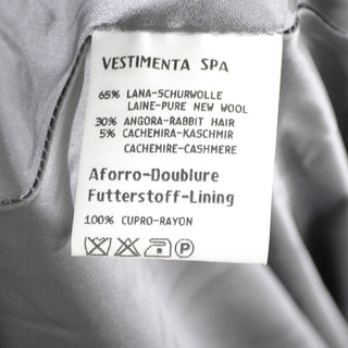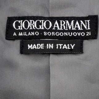 The gray of the coat has a slight green cast to the hue and it is fully lined in a gray rayon. This piece has the Giorgio Armani A Milano Borgonuovo 21 Made in Italy label and the Vestimenta Spa content label.