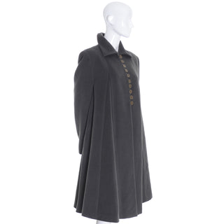 This is a beautiful gray vintage swing coat designed by Giorgio Armani. This coat buttons up the front and has nice details, side slit pockets, and the fabric is 65% wool, 30% angora, and 5% cashmere.